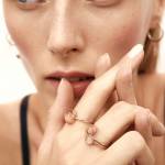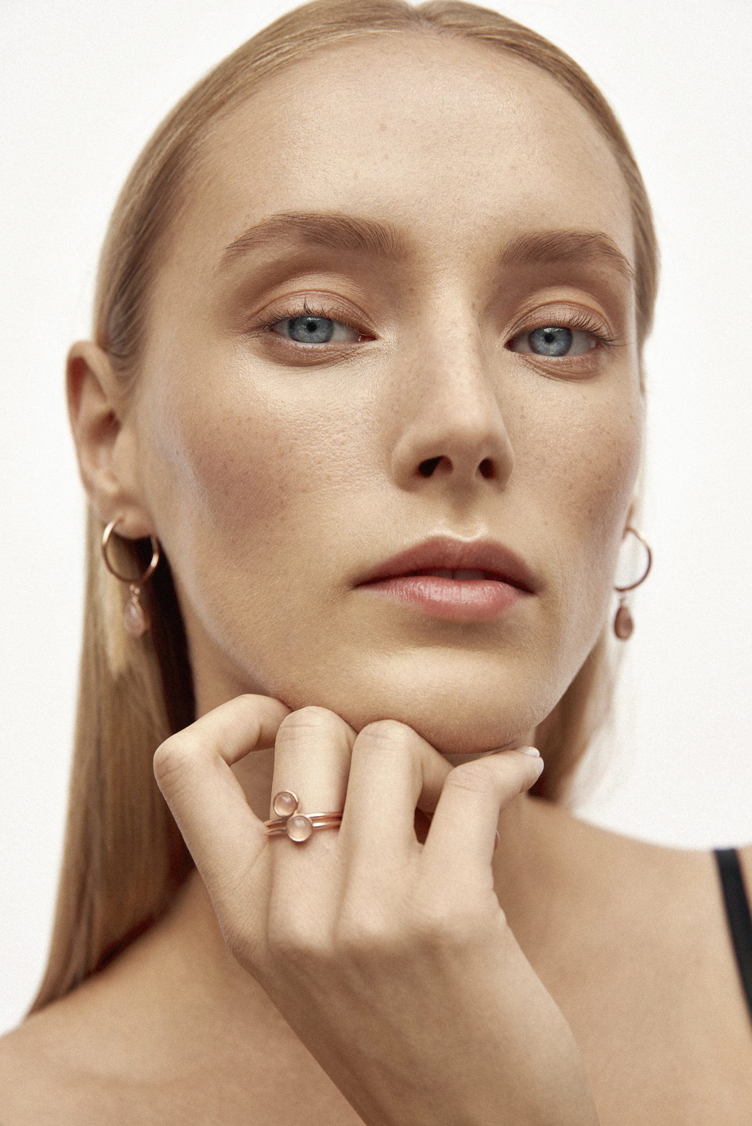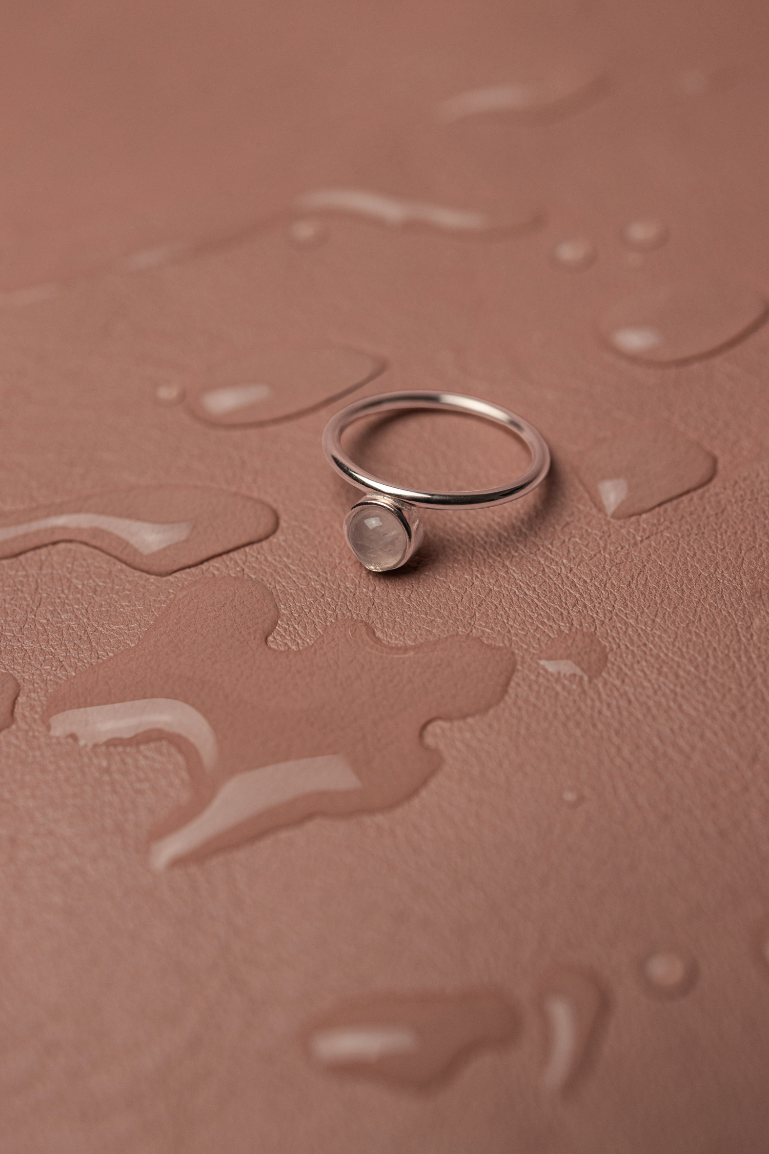 Pierścionek z różowym kwarcem, wykonany ręcznie ze srebra pr. 925, a następnie pozłocony różowym złotem. Wielkość minerału: 5 mm. Grubość obrączki: 1,5 mm.