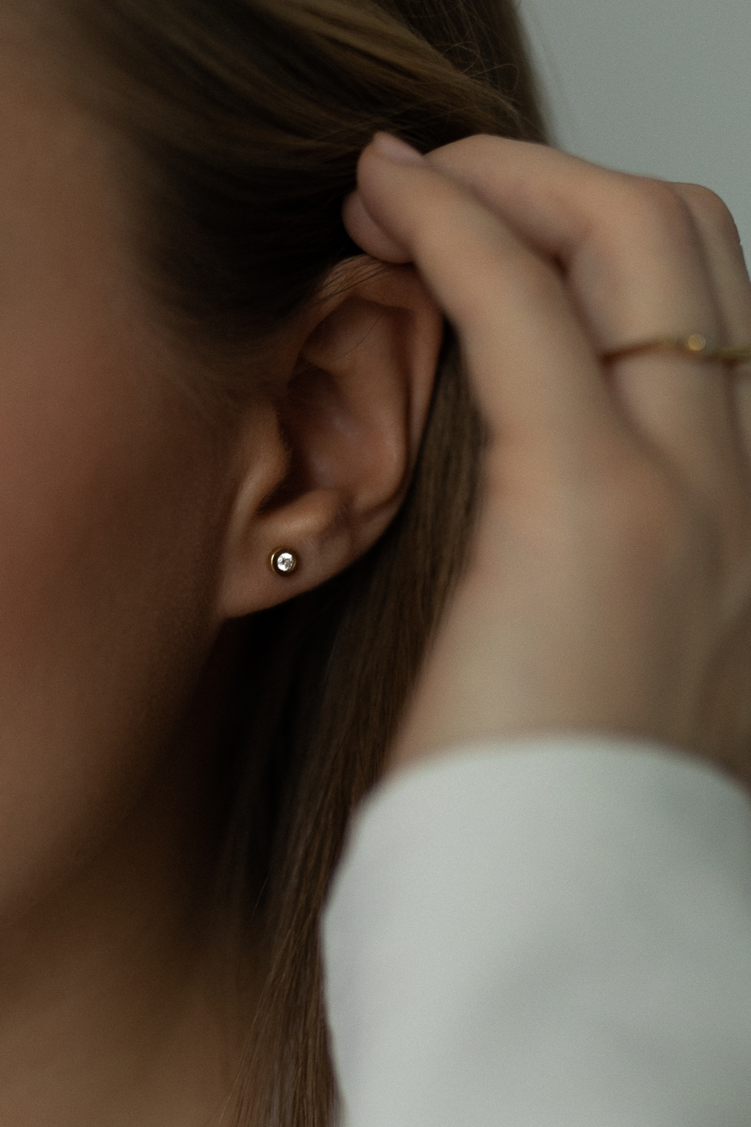 Kolczyki wykonane ręcznie ze złota próby 585 (14 karatów) z brylantami bardzo dobrej jakości (H/Vs/bd). Średnica diamentów: 2,5 mm (masa 0.06 ct). Średnica kolczyka 4,5 mm. Na życzenie możemy te kolczyki stworzyć także w białym złocie.