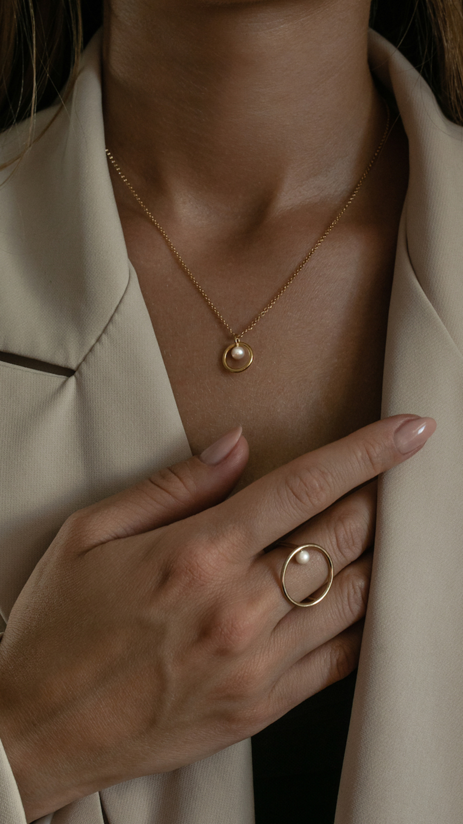 Nowoczesny, autorski pierścionek wykonany ręcznie z 14-karatowego złota (próba 585) z okrągłą perłą słodkowodną. Przy zamówieniu prosimy o podanie rozmiaru jubilerskiego lub średnicy wewnętrznej w mm.