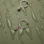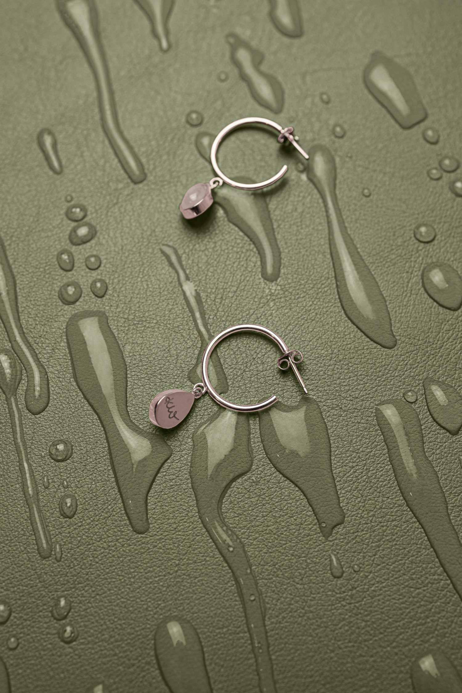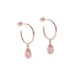 Hoop earrings with teardrop-shaped rose quartz, handmade with sterling silver and gilded with rose gold. Hoop size: 20 mm. Mineral size: 6 x 9 mm.