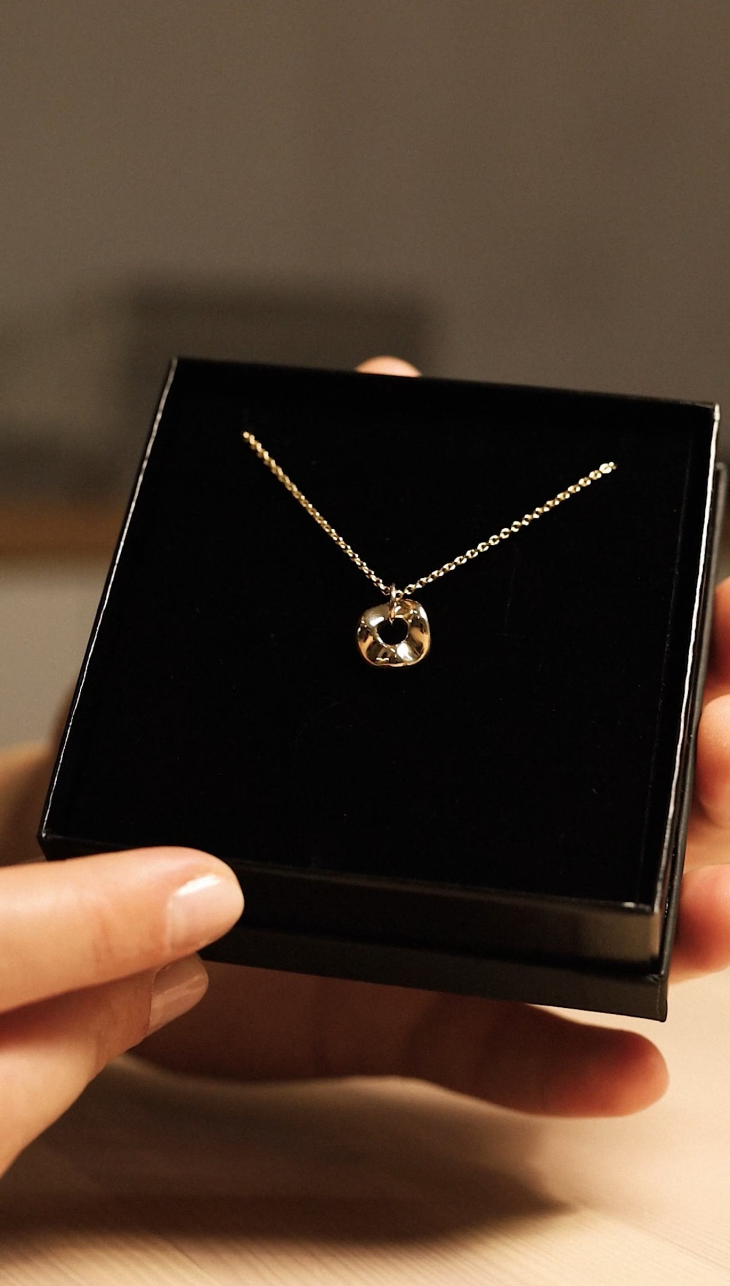 A unique necklace, handcrafted as a one-of-a-kind piece, combines precision craftsmanship with subtle elegance. The pendant, with a diameter of 10 mm, is made from solid 585 gold and features a delicate, organic shape that appears to flow seamlessly into the surrounding space, creating an effect of lightness and harmony. Its full construction ensures durability while emphasizing the noble quality of the material.