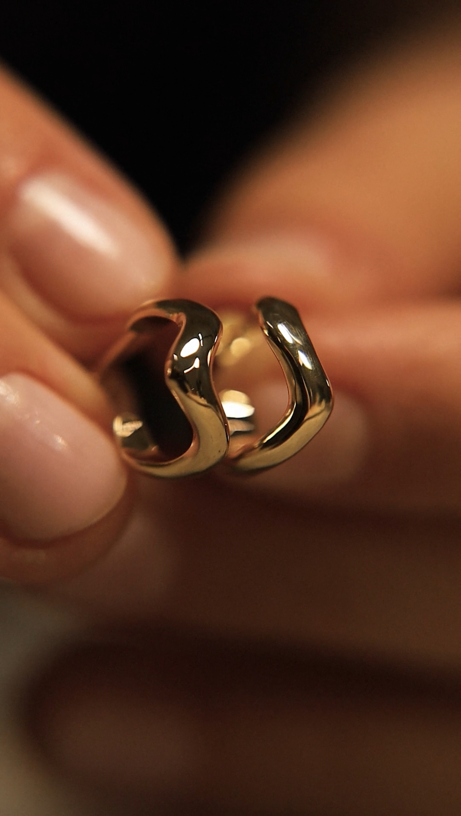 The earrings’ organic, rounded shape draws attention with its fluidity and harmony, while the smooth surface reflects light beautifully, enhancing the noble quality of gold. This exceptional accent perfectly complements any outfit, adding a subtle yet sophisticated and unique detail.